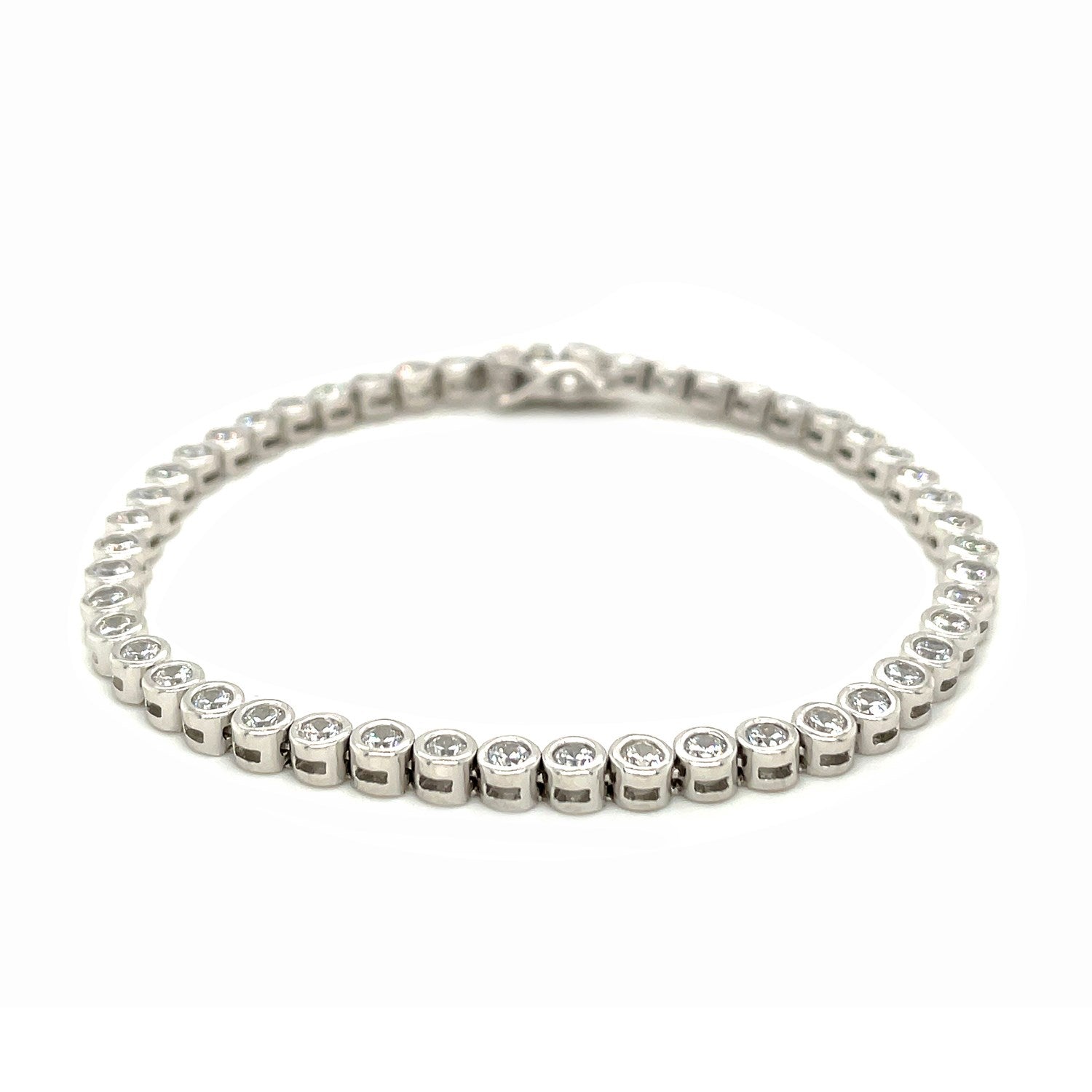 Sparkling round cubic zirconia combine beautifully in this unique sterling silver tennis bracelet. Bracelet is 7 1/4 inches long and closes with a box catch clasp.